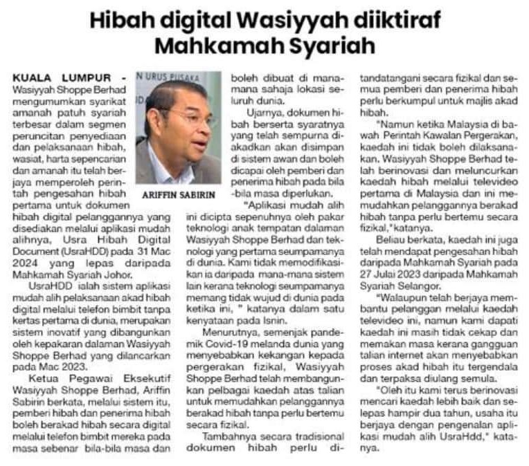 Perkembangan teknologi zaman kini dan penerimaan dari segi undang-undang memudahkan semua pihak. Kini Wasiyyah Shoppe Berhad telah membangunkan satu platform digital pertama di dunia untuk dokumentasi hibah secara tidak langsung meraikan perkembangan dunia tanpa kertas (paperless). Walaupun pemberi dan penerima berjauhan, dokumentasi hibah digital tetap dapat dilaksanakan. Yang lebih penting ialah ia diterima oleh Mahkamah Tinggi Syariah bagi pengesahan hibah. Oleh itu, hibah digital adalah pilihan yang tepat bagi menjaga bukti untuk pengesahan hibah kelak. Jom pilih WSB sebagai pihak yang menyediakan dokumentasi hibah untuk tuan puan!